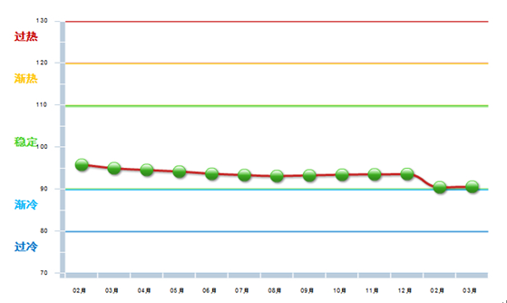 3月份中轻景气指数为90.58,位于“稳定”区域,环比上升0.17点,同比下降5.23点,(参见图1-1)。