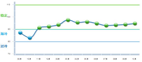 中国轻工业经济运行及预测预警系统数据显示:2016年10月份中轻景气指数为87.75,环比上升0.05点,仍处于蓝色渐冷区间。本年前10月该指数呈波动下行走势,10月较年初下降1.07点。