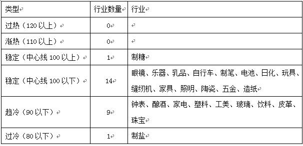 25个行业进行监测,所有行业均位于“稳定”区间及以下区间,其中:制糖、眼镜、乐器、乳品、自行车、制笔、电池、日化、玩具、缝纫机、家具、照明、陶瓷、五金、造纸等15个行业在“稳定”区间,占比60%,较上月扩大20个百分点;钟表、酿酒、家电、塑料、工美、玻璃、饮料、皮革、珠宝等9个行业处于“趋冷”区间,占比36%,较上月下降16个百分点;制盐行业处于“过冷”区间。整体行业景气情况如下: