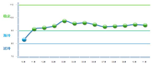 从分指标运行指数来看,今年以来主营、出口、利润三项分项景气指数均高于去年年末水平,资产景气指数略低于去年末期数。从前11月月度走势看,主营、资产景气指数保持平稳;出口景气指数上半年波动下降,7月后企稳;利润景气指数逐月下滑。11月当月,主营业务收入指数86.73,较上月上升0.32点;出口景气指数94.27,环比下降0.45点。资产景气指数91.40,环比下降0.07点。利润景气指数85.38,较上月下降0.11点。