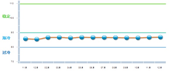 中国轻工业经济运行及预测预警系统数据显示:2016年12月份中轻景气指数为98.98,仍处于蓝色渐冷区间。从本年月度走势看,1-9月轻工景气指数波动下行,第四季度开始企稳回升,12月环比上升0.12点。