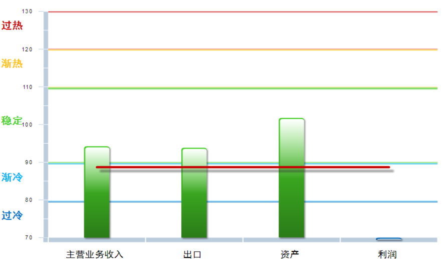 从分项指数看,主营业务收入景气指数94.23,位于“稳定”区间,较上月下降0.1点;出口景气指数为93.85,位于“稳定”区间,较上月下降15.03点;资产景气指数为101.77,位于“稳定”区间,较上月下降0.4点;利润景气指数63.47,位于“过冷”区间,较上月上升6.05点。