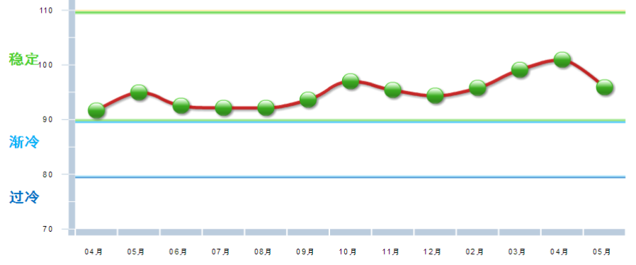 据中国轻工业经济运行及预测预警系统数据显示,2018年5月中国酿酒行业景气指数为95.91,处在绿色“稳定”区间,较4月下降5.03点。