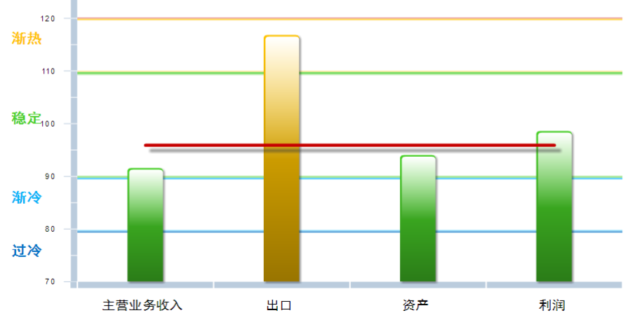 从分项指数看,资产景气指数小幅上升,主营、出口、利润景气指数环比下降,其中:主营业务收入景气指数91.59,位于“稳定”区间,较上月下降0.97点;出口景气指数为116.83,位于“渐热”区间,较上月下降49.73点;资产景气指数为94.05,位于“稳定”区间,较上月上升0.81点;利润景气指数98.62,位于“稳定”区间,较上月下降2.41点。