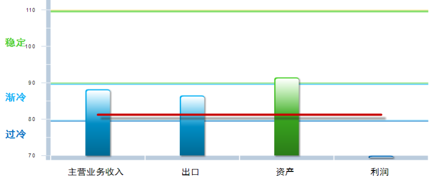 四项分项指数中,主营业务收入及出口景气指数环比下降,资产及利润环比上月均有下降其中:主营业务收入景气指数88.23,位于“渐冷”区间,较上月下降0.3点;出口景气指数为86.51,位于“渐冷”区间,较上月下降2.71点;资产景气指数为91.47,位于“稳定”区间,较上月回升0.23点;利润景气指数54.08,位于“过冷”区间,较上月回升8.0点。