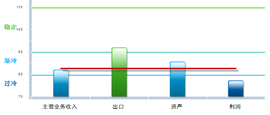 四项分项指数中,利润、资产景气指数环比下降,主营业务收入、出口景气指数环比上升,其中:主营业务收入景气指数82.0,位于“渐冷”区间,较上月回升0.18点;出口景气指数为91.94,位于“稳定”区间,较上月回升1.8点;资产景气指数为85.63,位于“渐冷”区间,较上月下降0.01点;利润景气指数77.23,位于“过冷”区间,较上月下降0.58点。