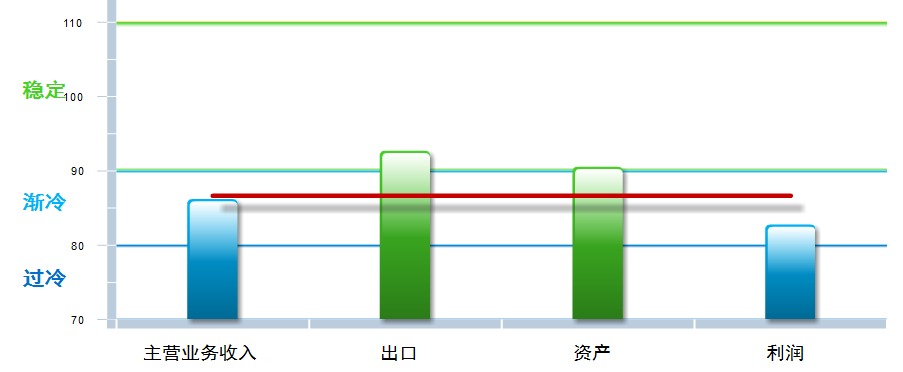 四项分项中,出口景气指数环比回升,资产景气指数持平,主营业务收入和利润指数环比上月均有下降,其中:主营业务收入景气指数86.22,位于“渐冷”区间,较上月下降0.38点;出口景气指数为92.70,位于“稳定”区间,较上月上升1.48点;资产景气指数为90.56,位于“稳定”区间,与上月持平;利润景气指数82.79,位于“渐冷”区间,较上月下降0.65点。