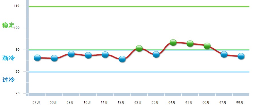 除出口景气指数外,其他三项分类指数环比上月均有下降,其中:主营业务收入景气指数88.83,位于“渐冷”区间,较上月下降0.67点;出口景气指数为76.78,位于“过冷”区间,较上月上升3.7点;资产景气指数为87.54,位于“渐冷”区间,较上月下降0.95点;利润景气指数91.65,位于“稳定”区间,较上月下降3.52点。