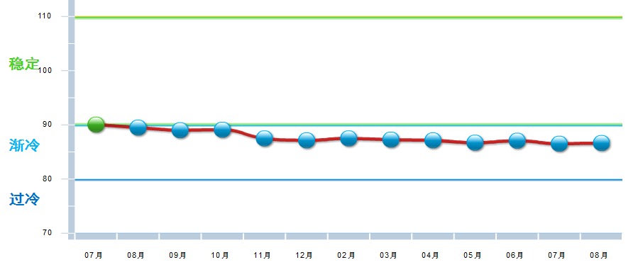 除出口景气指数外,其他三项分类指数环比上月均有下降,其中:主营业务收入景气指数86.69,位于“渐冷”区间,较上月下降0.24点;出口景气指数为96.94,位于“稳定”区间,较上月上升3.85点;资产景气指数为88.01,位于“渐冷”区间,较上月下降0.25点;利润景气指数81.42,位于“渐冷”区间,较上月下降0.17点。
