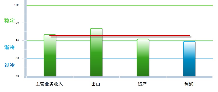 除出口景气指数外,其他三项分类指数环比上月均有下降,其中:主营业务收入景气指数93.51,位于“稳定”区间,较上月下降0.5点;出口景气指数为96.99,位于“稳定”区间,较上月上升2.38点;资产景气指数为91.01,位于“稳定”区间,较上月下降0.31点;利润景气指数89.67,位于“渐冷”区间,较上月下降2.43点。