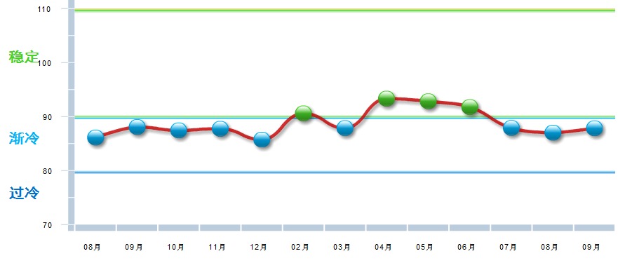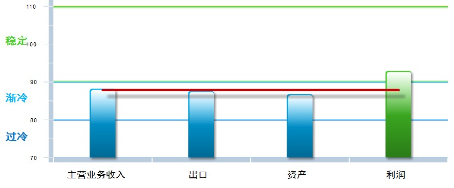 四项分项指数环比均有下降,出口景气指数下降幅度较大,其中:主营业务收入景气指数88.23,位于“渐冷”区间,较上月下降0.6点;出口景气指数为87.62,位于“渐冷”区间,较上月上升10.84点;资产景气指数为86.76,位于“渐冷”区间,较上月下降0.78点;利润景气指数92.95,位于“稳定”区间,较上月上升1.3点。