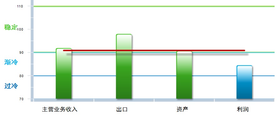 分项指数中,出口景气指数环比回升,其他三项指数环比均有下降,其中:主营业务收入景气指数91.90,位于“稳定”区间,较上月下降1.61点;出口景气指数为97.97,位于“稳定”区间,较上月上升0.98点;资产景气指数为90.76,位于“稳定”区间,较上月下降0.25点;利润景气指数84.49,位于“渐冷”区间,较上月下降5.18点。