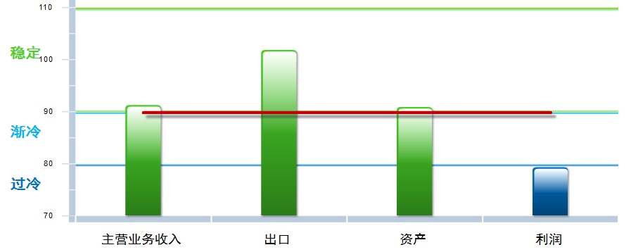 分项景气指数中,主营业务收入、利润景气指数环比小幅下降,出口和资产均较上月回升,其中:主营业务收入景气指数91.28,位于“稳定”区间,较上月下降0.62点;出口景气指数为101.85,位于“稳定”区间,较上月上升3.88点;资产景气指数为90.91,位于“稳定”区间,较上月回升0.15点;利润景气指数79.36,位于“过冷”区间,较上月下降5.13点。