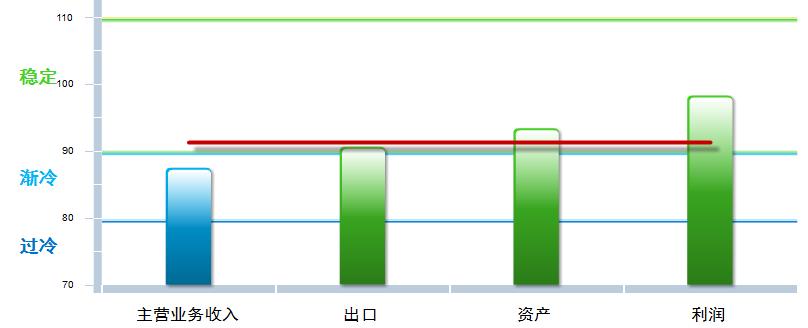 分项景气指数中,除利润景气指数小幅回升外,其他三项分项指数均较去年末下降,其中:营业收入景气指数87.47,位于“渐冷”区间,较去年末下降2.2点;出口景气指数为90.62,位于“稳定”区间,较去年末下降47.41点;资产景气指数为93.37,位于“稳定”区间,较去年末下降2.34点;利润景气指数98.26,位于“稳定”区间,较去年末回升1.41点。
