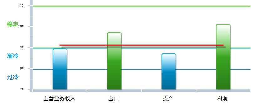 分项景气指数中,除资产景气指数小幅下降外,其他三项分项指数均较去年末回升,其中:营业收入景气指数89.48,位于“渐冷”区间,较去年末回升1.13点;出口景气指数为97.16,位于“稳定”区间,较去年末回升27.76点;资产景气指数为87.16,位于“渐冷”区间,较去年末下降1.8点;利润景气指数100.95,位于“稳定”区间,较去年末回升2.63点。