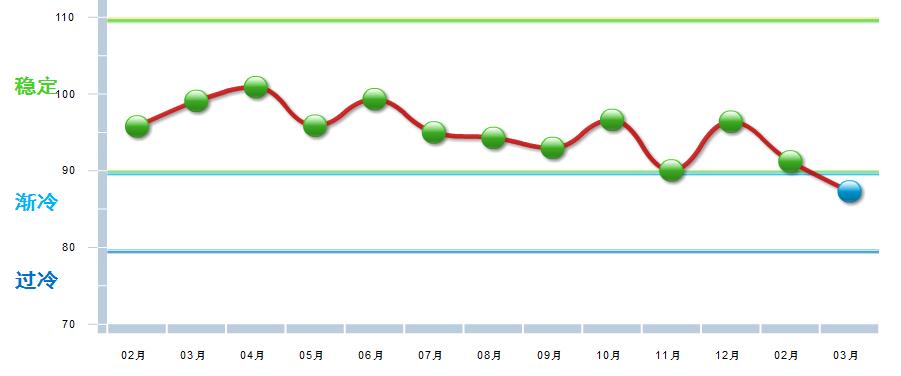 四项分项景气指数环比2月均有下降,出口指数下降幅度较大,其中:营业收入景气指数87.41,位于“渐冷”区间,较2月下降0.06点;出口景气指数为55.91,位于“过冷”区间,较2月下降34.71点;资产景气指数为92.95,位于“稳定”区间,较去年末下降0.42点;利润景气指数93.57,位于“稳定”区间,较去年末下降4.69点。