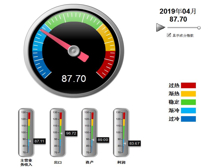 四项分项景气指数环比3月均有下降,营收、利润指数下降幅度较大,其中:营业收入景气指数87.11,位于“渐冷”区间,较3月下降1.42点;出口景气指数为98.72,位于“稳定”区间,较3月下降0.39点;资产景气指数为89.00,位于“渐冷”区间,较3月下降0.49点;利润景气指数83.67,位于“渐冷”区间,较3月下降1.9点。