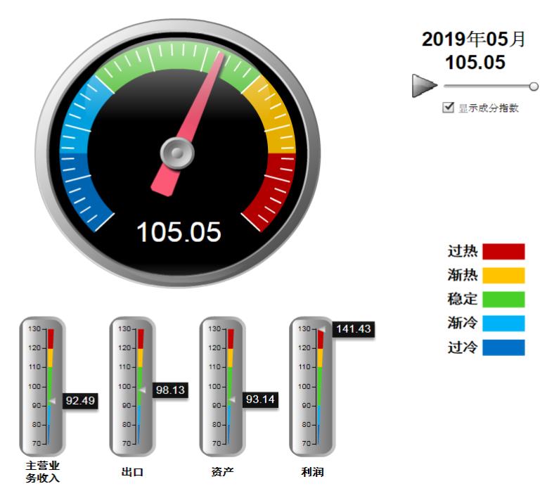 四项分项指数环比4月均有回升,利润、出口景气指数回升幅度较大。其中:营业收入景气指数92.49,位于“稳定”区间,较4月回升0.53点;出口景气指数为98.13,位于“稳定”区间,较4月回升3.07点;资产景气指数为93.14,位于“稳定”区间,较4月上升0.14点;利润景气指数141.43,位于“过热”区间,较4月回升6.84点。