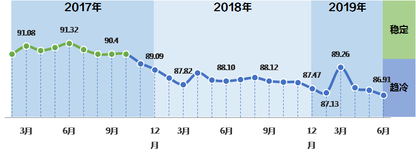 中国轻工业经济运行及预测预警系统数据显示:2019年,中轻景气指数继续在蓝色“趋冷”区间波动,6月中轻景气指数为86.91,较5月下降0.42点,较去年同月下降1.19点。