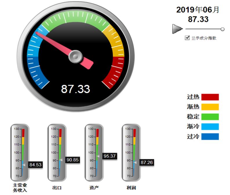 分项指数中除资产景气指数外环比上月均有下降。其中:营业收入景气指数84.53,位于“渐冷”区间,较5月下降1.22点;出口景气指数为90.85,位于“稳定”区间,较5月下降1.83点;资产景气指数为95.37,位于“稳定”区间,较5月回升0.45点;利润景气指数87.26,位于“渐冷”区间,较5月下降0.07点。