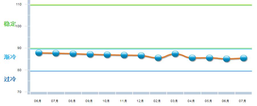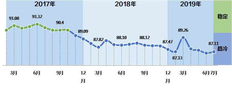 中国轻工业经济运行及预测预警系统数据显示:2019年,中轻景气指数继续在蓝色“趋冷”区间波动,7月中轻景气指数为87.11,较6月回升0.2点,较去年同月下降1.13点。