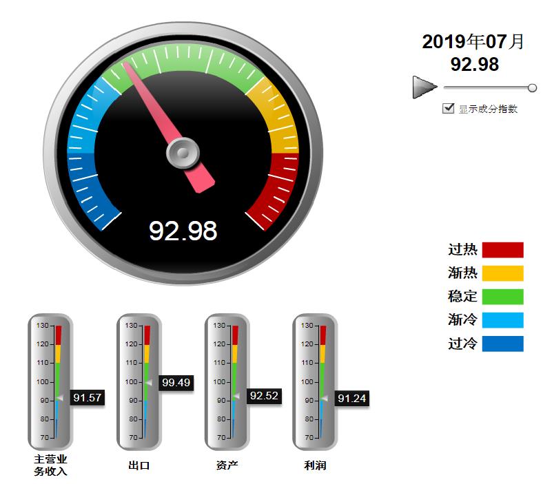 分项指数中,营收、利润景气指数环比下降,出口、资产景气指数环比上升:营业收入景气指数91.57,位于“稳定”区间,较6月下降0.51点;出口景气指数为99.49,位于“稳定”区间,较6月上升3.38点;资产景气指数为92.52,位于“稳定”区间,较6月上升0.78点;利润景气指数91.24,位于“稳定”区间,较6月下降24.91点。