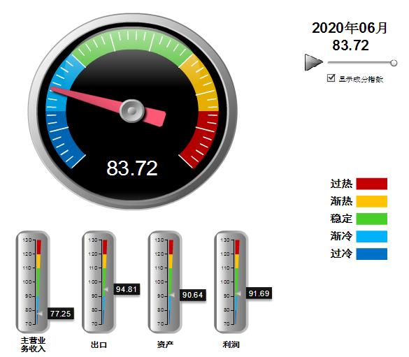 四项分项景气指数环比上月均有上升,出口景气指数上升幅度较大。其中:营业收入景气指数77.25,位于“过冷”区间,环比上升1.84点;出口景气指数为94.81,位于“稳定”区间,环比上升7.2点;资产景气指数为90.64,位于“稳定”区间,环比上升0.14点;利润景气指数91.69,位于“稳定”区间,环比上升3.67点。