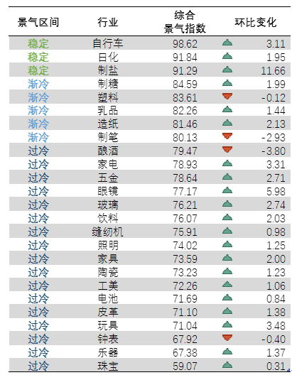2020年7月, 对全国 25个重点行业进行监测,自行车、日化、制盐行业景气度回升至“稳定”区间,制糖、塑料、乳品、造纸、制笔5个行业位于“渐冷”区间,酿酒、家电、五金等17个行业位于“过冷”区间。与6月相比,25个重点行业中有21个行业综合景气度回升。整体行业景气情况如下: