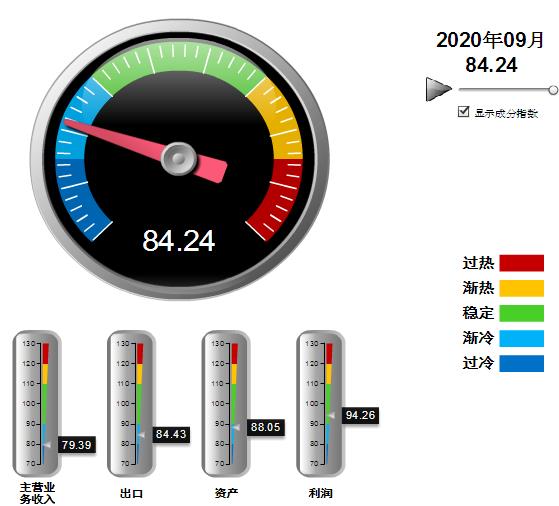 分项景气指数中,营收、利润、出口指数较上月均有上升,利润景气指数上升幅度较大;资产景气指数小幅下降。其中:营业收入景气指数79.39,位于“过冷”区间,环比回升1.26点;出口景气指数为84.43,位于“渐冷”区间,环比上升0.31点;资产景气指数为88.05,位于“渐冷”区间,环比下降0.05点;利润景气指数94.26,位于“稳定”区间,环比上升5.02点。
