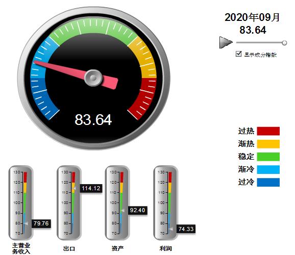 分项景气指数中,出口指数高位环比小幅回落,营收、利润、资产指数均有上升。其中:营业收入景气指数79.76,位于“过冷”区间,环比上升2.45点;出口景气指数为114.12,位于“渐热”区间,环比下降0.68点;资产景气指数为92.40,位于“稳定”区间,环比上升0.44点;利润景气指数74.33,位于“过冷”区间,环比上升5.73点。