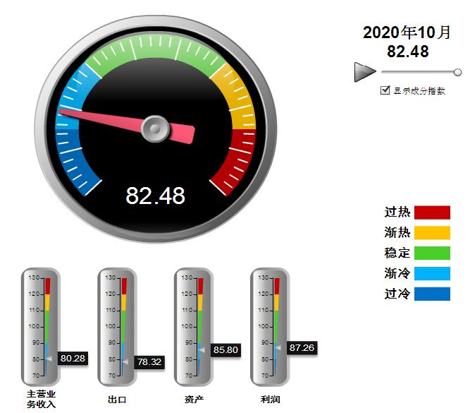 分项景气指数中,营收景气指数环比小幅上升,出口、利润、资产指数均有下降,出口指数下降幅度较大。其中:营业收入景气指数80.28,位于“渐冷”区间,环比上升0.18点;出口景气指数为78.32,位于“过冷”区间,环比下降5.36点;资产景气指数为85.80,位于“渐冷”区间,环比下降0.18点;利润景气指数87.26,位于“渐冷”区间,环比下降1.6点。
