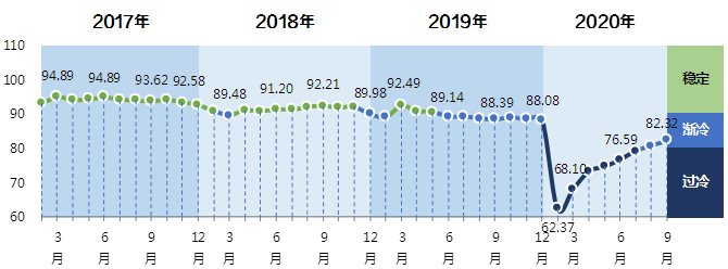 中国轻工业经济运行及预测预警系统数据显示:轻工大家居产业综合景气指数2020年呈触底回升走势。受新冠疫情影响,年初大幅下降至“过冷”区间;但随着轻工企业复工复产复市进度加快,该产业综合景气度3月以来持续回升,第三季度已回升至“渐冷”区间。2020年9月轻工大家居产业综合景气指数为82.32,较8月回升1.69点,较一季度末回升14.22点。