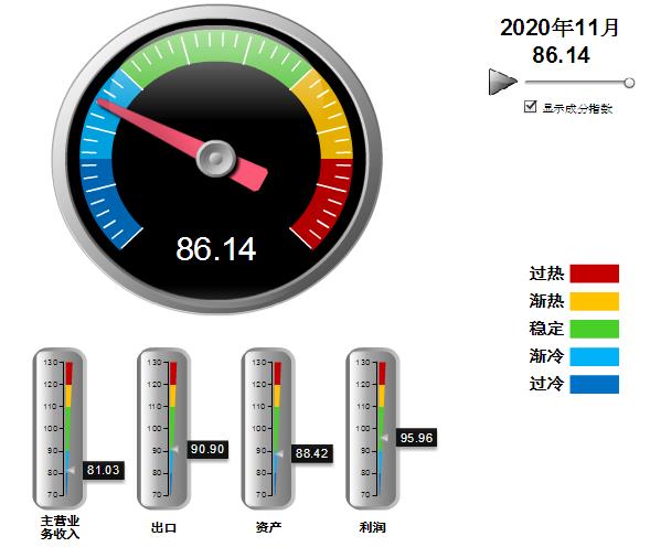 四项分项景气指数环比上月均保持上升。其中:营业收入景气指数81.03,位于“渐冷”区间,环比上升0.43点;出口景气指数为90.90,位于“稳定”区间,环比上升1.27;资产景气指数为88.42,位于“渐冷”区间,环比上升0.29点;利润景气指数95.96,位于“稳定”区间,环比上升0.5点。