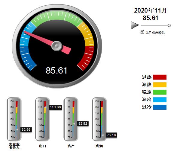 四项分项景气指数环比上月均有上升,出口指数上升幅度较大。其中:营业收入景气指数82.86,位于“渐冷”区间,环比上升1.65点;出口景气指数为119.88,位于“趋热”区间,环比上升7.16点;资产景气指数为92.52,位于“稳定”区间,环比上升0.13点;利润景气指数73.18,位于“过冷”区间,环比上升1.5点。