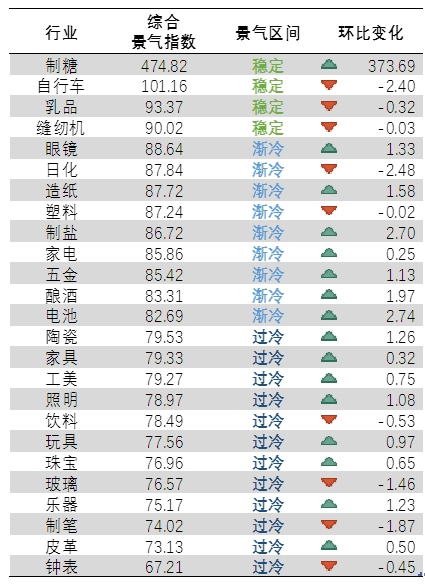 25个重点行业进行监测,制糖、自行车、乳品、缝制机械等4个行业景气度位于“稳定”区间,占16%。眼镜、日化、造纸、塑料、制盐、家电、五金、酿酒、电池等9个行业位于“渐冷”区间,占36%。钟表、皮革、制笔等12个行业位于“过冷”区间,占48%。与11月相比,25个重点行业中有16个行业综合景气度回升。整体行业景气情况如下:
