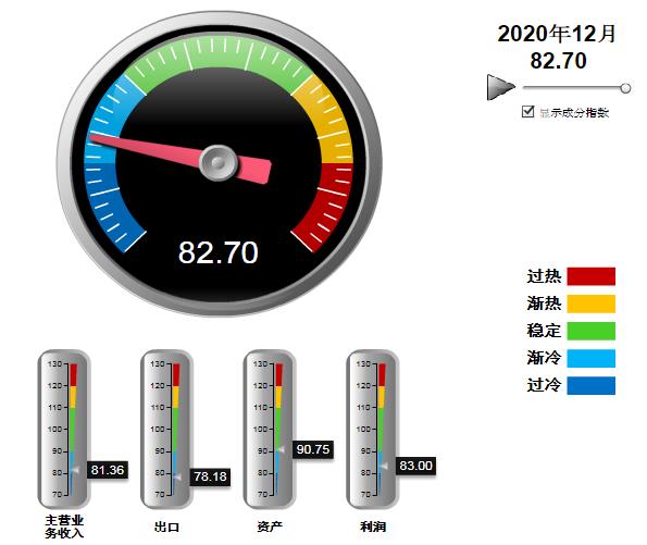 分项景气指数中,利润指数环比上月小幅上升,其他指数环比下降,出口指数下降幅度较大。其中:营业收入景气指数81.36,位于“渐冷”区间,环比下降0.26点;出口景气指数为78.18,位于“过冷”区间,环比下降2.24点;资产景气指数为90.75,位于“稳定”区间,环比下降1.33点;利润景气指数83.00,位于“渐冷”区间,环比上升0.34点。