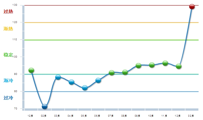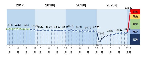 中国轻工业经济运行及预测预警系统数据显示:受国内新冠疫情控制较好,去年同期基数较低等因素影响,2021年2月轻工业生产、效益指标同比大幅上涨,轻工业综合景气指数升至“过热”区间。2月中轻景气指数为121.80,较上年末上升38.34点。