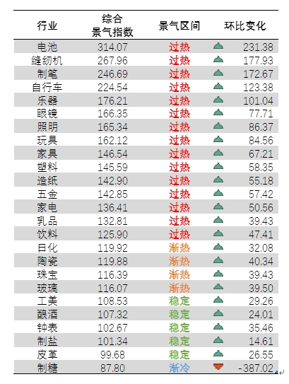 25个重点行业进行监测,电池、缝纫机、制笔、自行车、乐器等15个行业景气度位于“过热”区间,占60%。日化、陶瓷、珠宝、玻璃4个行业位于“渐热”区间,占16%。工美、酿酒、钟表、制盐、皮革5个行业位于“稳定”区间,占20%。制糖行业位于“渐冷”区间。整体行业景气情况如下: