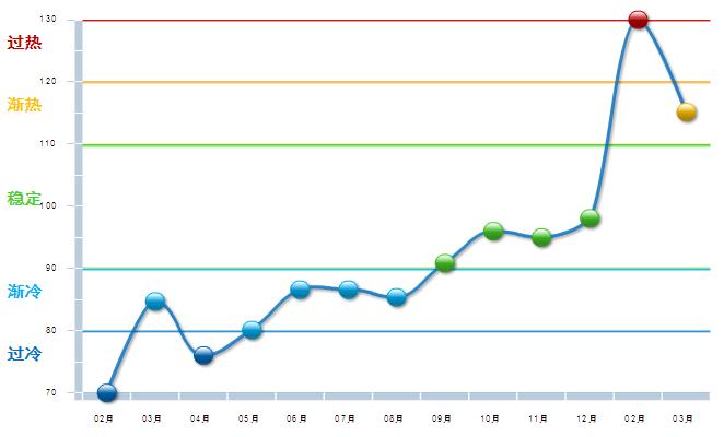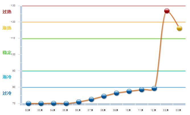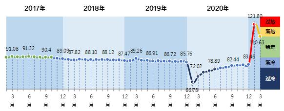 中国轻工业经济运行及预测预警系统数据显示:受国内新冠疫情控制较好,去年同期基数较低等因素影响,2021年一季度轻工业生产、效益指标同比大幅上涨。3月中轻景气指数为110.63,处在“渐热”区间,环比上月高位回落11.17点。