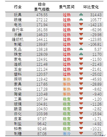 25个重点行业进行监测,玩具、眼镜、电池、自行车、乐器等13个行业景气度位于“过热”区间,占52%。照明、家具、饮料、陶瓷4个行业位于“渐热”区间,占16%。工美、玻璃、酿酒、日化等7个行业位于“稳定”区间,占28%。制糖行业位于“渐冷”区间。整体行业景气情况如下: