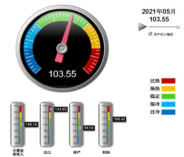 四项分项景气指数中,营收、出口景气指数环比下降,利润、资产指数小幅回升。其中:营业收入景气指数100.16,位于“稳定”区间,环比下降2.19点;出口景气指数为124.65,位于“过热”区间,环比下降47.75点;资产景气指数为94.54,位于“稳定”区间,环比上升0.6点;利润景气指数108.42,位于“稳定”区间,环比上升1.95点。