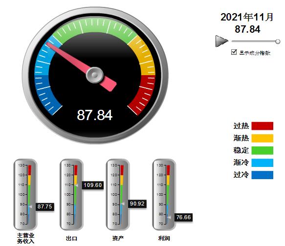 四项分项景气指数环比上月均有回升,出口指数回升幅度较大,其中:营业收入景气指数87.75,位于“渐冷”区间,环比上升0.11点;出口景气指数为109.60,位于“稳定”区间,环比上升8.96点;资产景气指数为88.63,位于“稳定”区间,环比上升0.71点;利润景气指数76.66,位于“过冷”区间,环比上升1.38点。