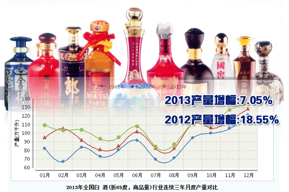 中国轻工业经济运行及预测预警系统显示,2013年1~12月,全国白酒(折65度,商品量)行业累计完成产量1,226.20万千升,同比增长7.05%。低于去年18.55%的增幅。(www.qgysj.org)