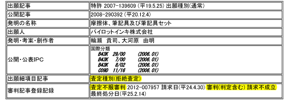 特願2007-139609被做出了驳回决定(拒絶査定)后,百乐墨水株式会社不服该决定,提出了对决定不服的审判请求,但被判定不服请求不成立,仍维持了驳回决定: