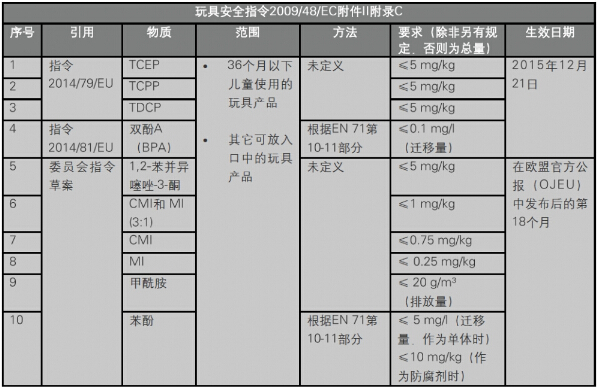 2014年6月,欧盟在其官方公报(OJEU)中公布了两项指令,目的是在玩具安全指令2009/48/EC (TSD) (1)中对特定玩具产品增加双酚A(BPA)和三种阻燃剂的限制。