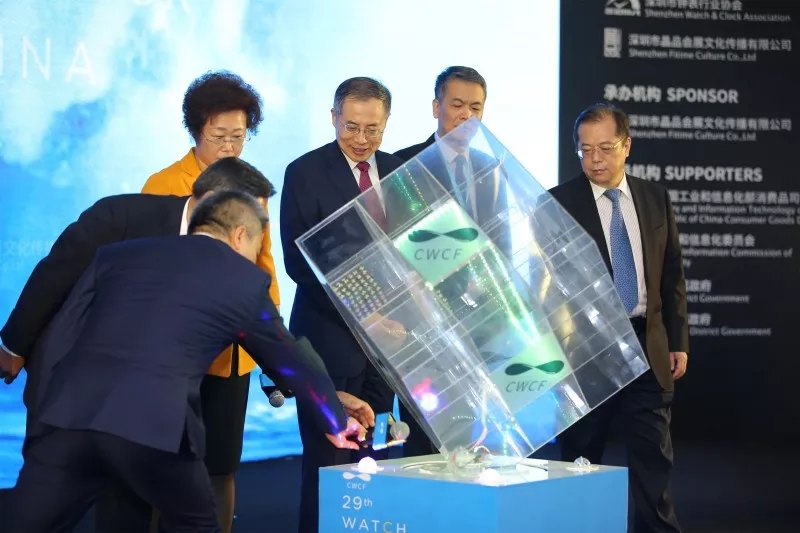 仪式上邀请了中国(深圳)国际钟表展创始人兼筹委会主席、深圳市钟表行业协会朱舜华会长、深圳市公平贸易促进署高瞻署长、深圳市光明区管委会胡汝林副主任、 副会长兼中国钟表协会陶小年理事长、中国工信部消费品司高延敏司长 中国企业联合会常务副会长、中国企业家协会朱宏任理事长、深圳市人民政府 吴以环副市长、 张崇和会长共同开启这一仪式。嘉宾们一起倒数计时,将手中的小魔方放入舞台中央的大魔方里,共同开启这场时间的饕餮盛宴。