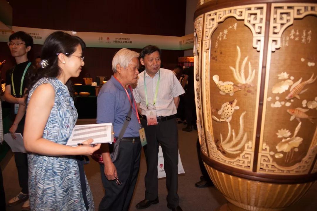 中国竹工艺精品展在世界竹藤大会第一天展出时就得到了包括国际竹藤组织总干事费翰思及众多国际友人的参观,并不时驻足观赏听取创作者的创作理念,表现出对中国竹工艺极其浓厚的兴趣,并与参展的众多竹工艺大师、竹工艺创作者合影留念。