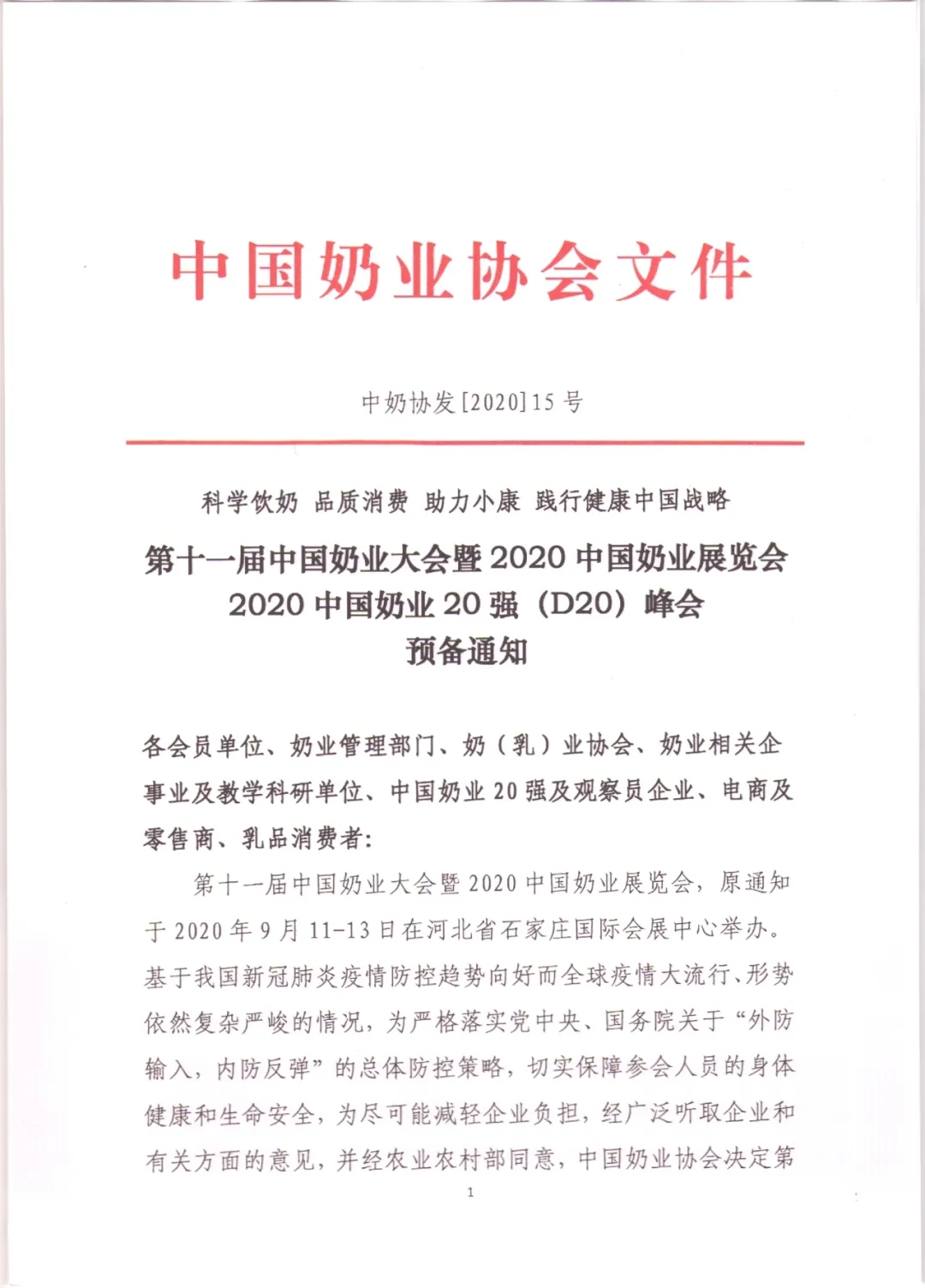3月27日,中国奶业协会向相关组织机构公开发出通知,第十一届中国奶业大会暨2020中国奶业展览会和2020中国奶业20强(D20)峰会同期同地召开,举办时间确定为2020年10月11-13日,举办地在河北省石家庄国际会展中心。 据了解,第十一届中国奶业大会暨2020中国奶业展览会,原通知于2020年9月11-13日在河北省石家庄国际会展中心举办。对于大会更改时间的主要原因,中国奶业协会方面表示,基于我国新冠肺炎疫情防控趋势向好而全球疫情大流行、形势依然复杂严峻的情况,为严格落实党中央、国务院关于“外防输入,内防反弹”的总体防控策略,切实保障参会人员的身体健康和生命安全,经广泛听取企业和有关方面的意见,并经农业农村部同意,中国奶业协会作出以上决定。 具体文件内容如下: