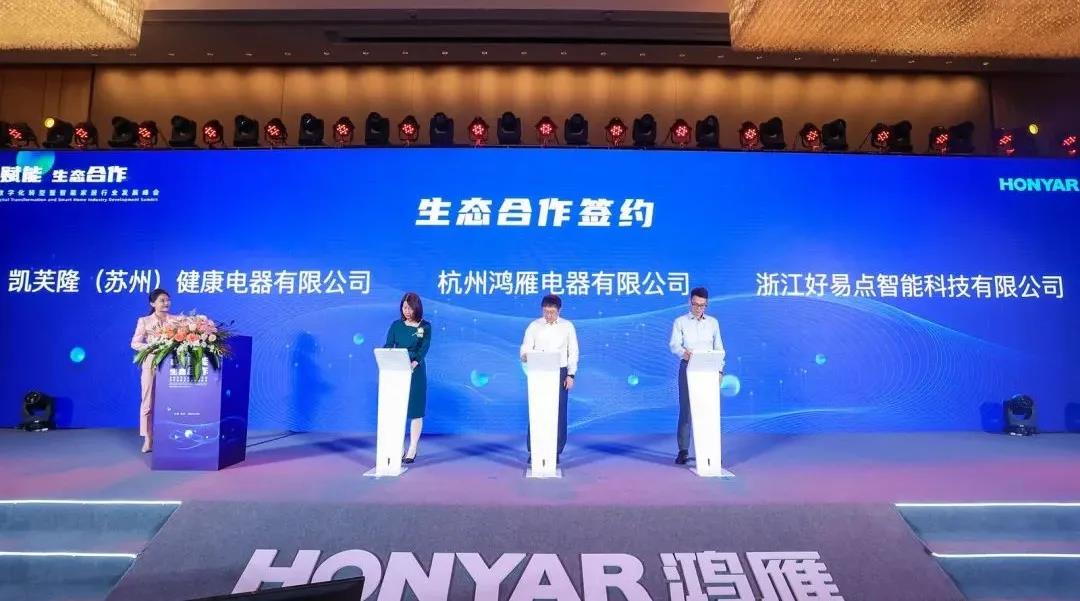 峰会上,鸿雁联合阿里云IoT事业部发布《鸿雁物联网应用与解决方案》,输出基于互联网云平台的全屋智能、未来社区、智慧园区等场景应用数字化解决方案,战略签约"技术平台、智造企业和行业应用"合作伙伴,缔造生态合作联盟。