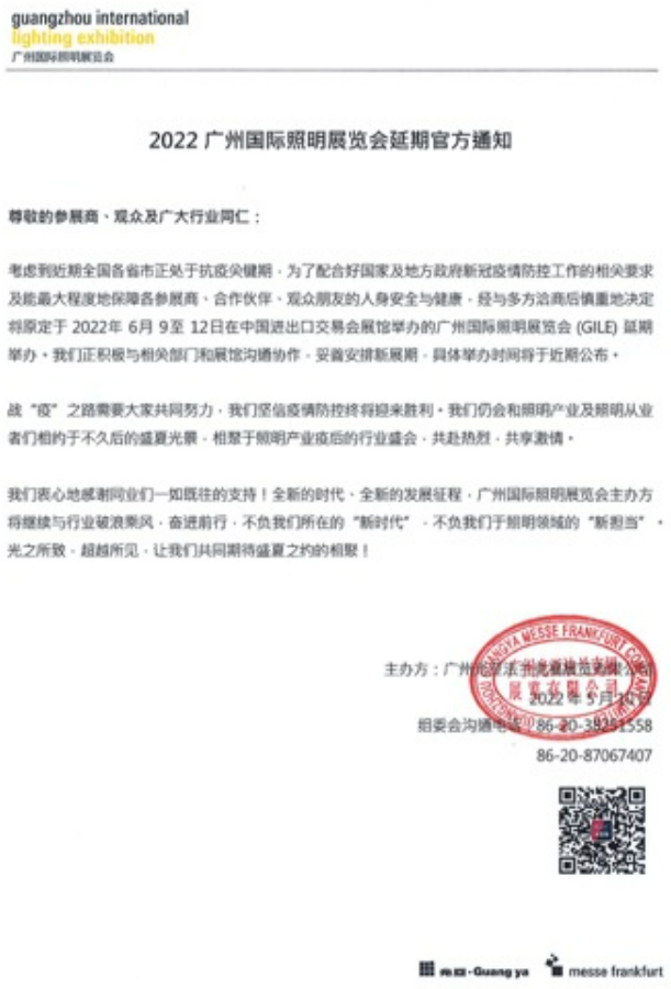 第27届广州国际照明展览会(GILE2022)延期举办的通知